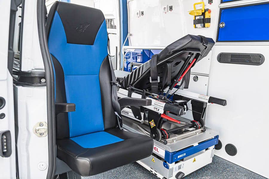 Chaque ambulance dispose d’un brancard évidemment et de nombreux rangements pour stocker les diverses accessoires, équipements et tout ce qui est nécessaire à la médicalisation selon les catégories. Cela peut aller du défibrillateur cardiaque, dont sont à l’heure actuelle, équipées la plupart des ambulances, des matelas coquilles, pansements, oxygène, frigo chaud ou froid selon ce que l’on transporte, alimentation en électricité, jusqu’aux matériels plus techniques pour la réanimation et les soins d’urgence. Il y a une norme de l’ARS pour les équipements qui doivent être dans l’ambulance.