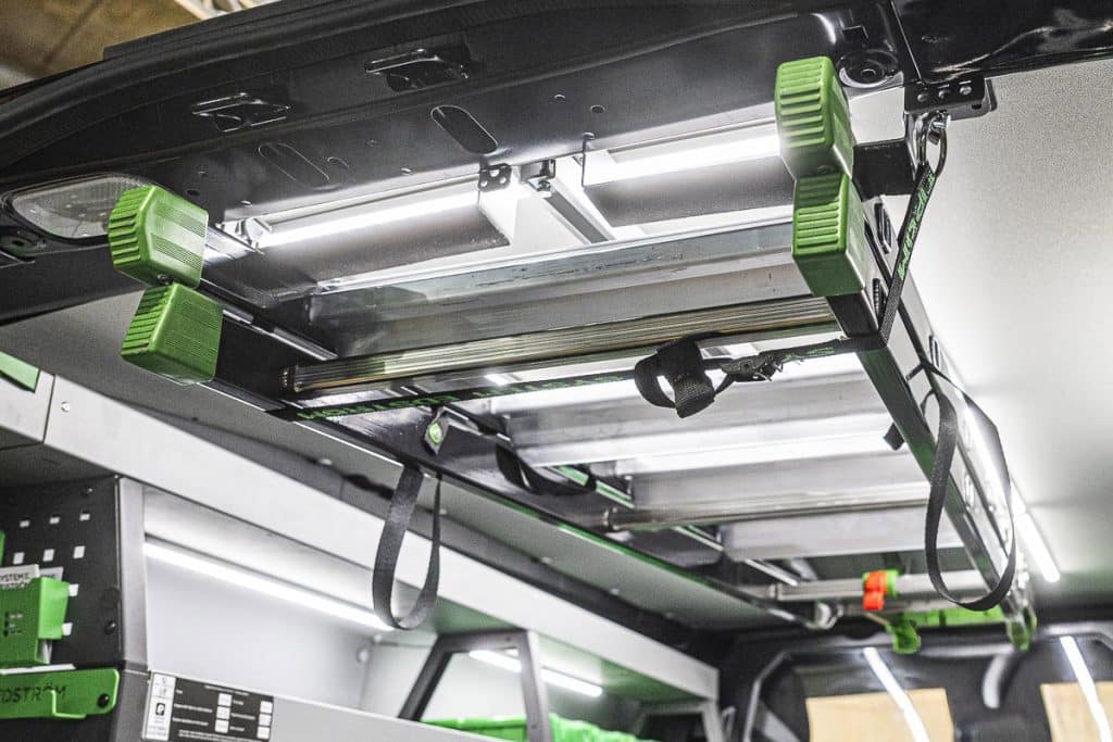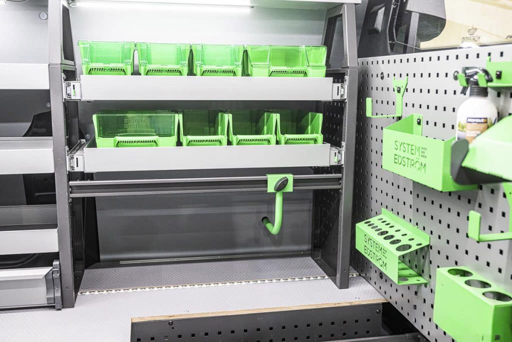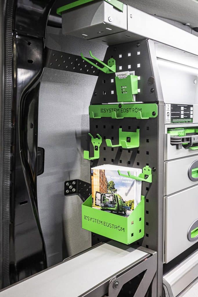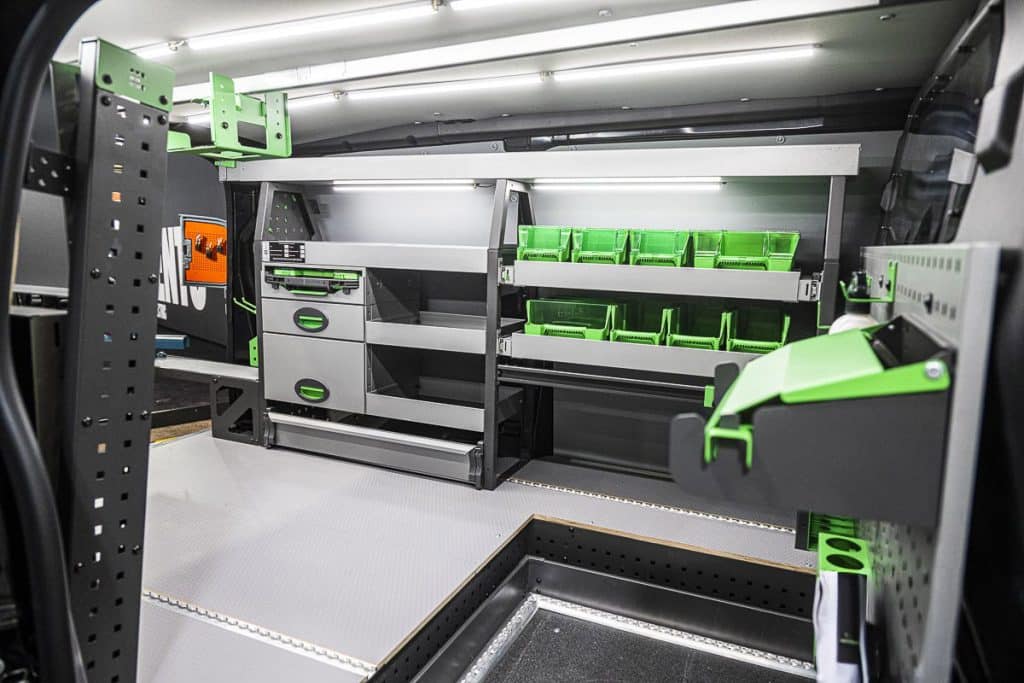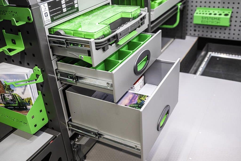 La modularité est une des qualités de ces aménagements. Les différents éléments sont repris entre des échelles de montage métalliques, sur lesquelles viennent se fixer les éléments, blocs tiroirs, étagères, armoires, coffres et autres plateformes coulissantes. Des pattes de fixation sont ensuite reprises sur la carrosserie afin de maintenir l’ensemble de manière sécurisée et durable. C’est un peu un mécano géant. Des panneaux perforés peuvent ensuite être mis et ils vont eux-mêmes permettre de monter tout un tas d’accessoires complémentaires : crochets, box divers, distributeur de papier, support à outils, support de visseuse, support pour tubes et cartouches, poignées, support de câble, etc.