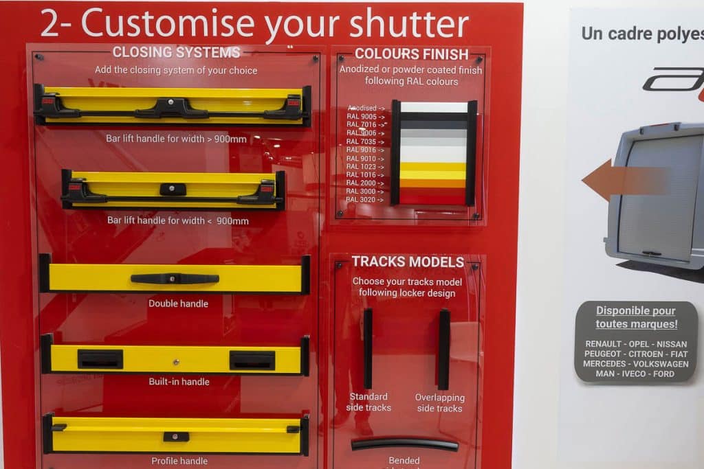 De nombreuses options sont disponibles. Choisissez d’abord le modèle de rideau coulissant qui va vous convenir, ses dimensions, les coloris et finitions, puis vous pouvez ensuite choisir les types de poignées, le type de rails et enfin les accessoire tels que système de fermeture, fermeture centralisée, sangle, éclairage.