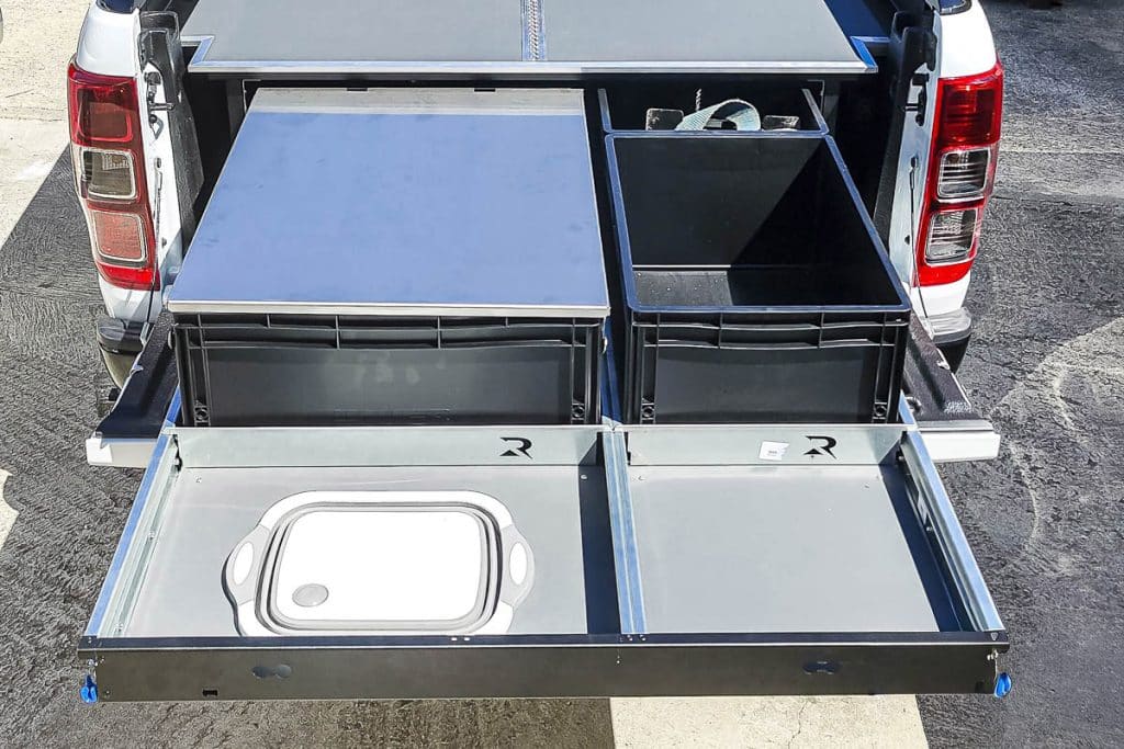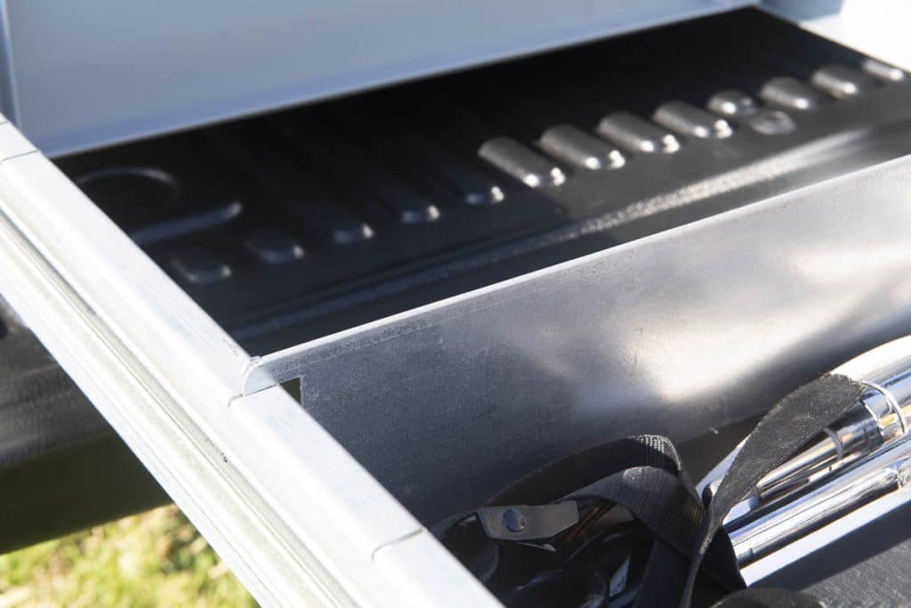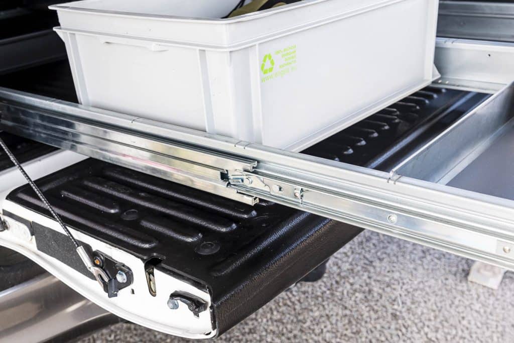 Grâce à un système breveté, le bloc tiroir Rockalu s’adapte à tous les pick-up double cabine / cabine approfondie grâce à ses rails réglables en largeur.