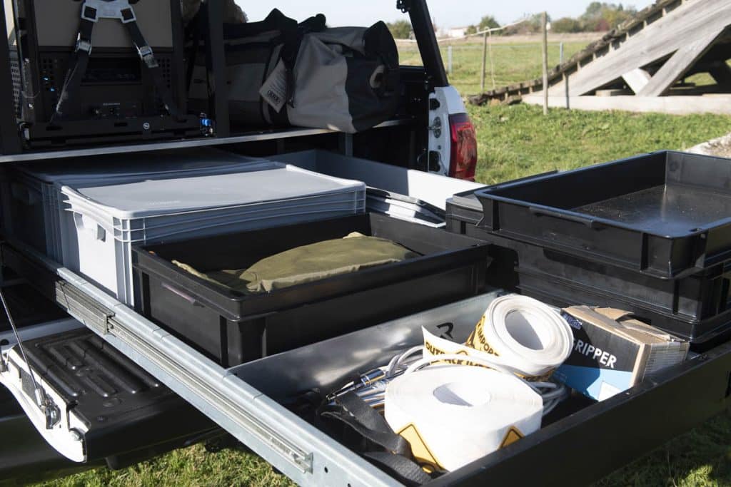 Ce bloc de tiroir fabriqué en tôle d’acier pour l’armature, en polypropylène pour les supports de box et en aluminium est destiné à être posé dans la benne d’un pick up.